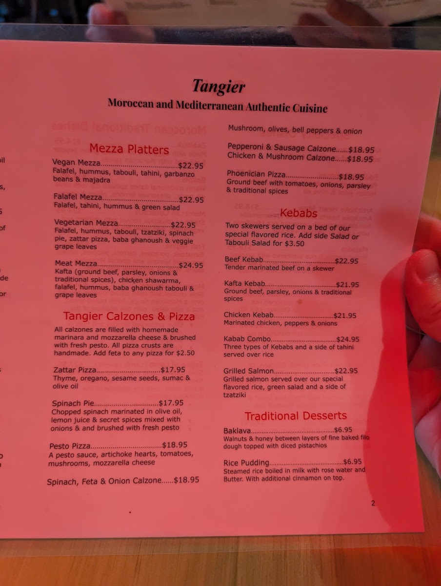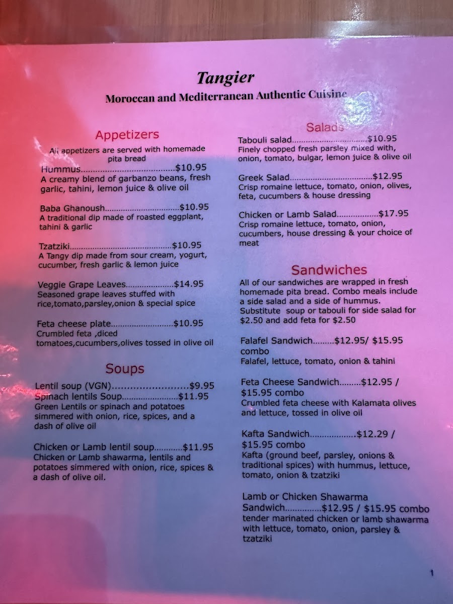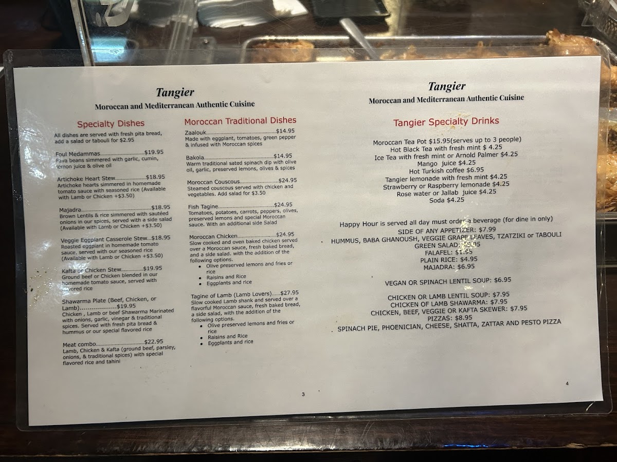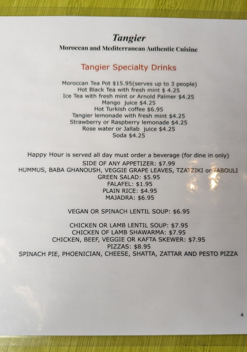 Vegetarian. Falafel, hummus, tabouli, tatziki, spinach pie, zattar pizza, baba ganoush, and veggie grape leaves.